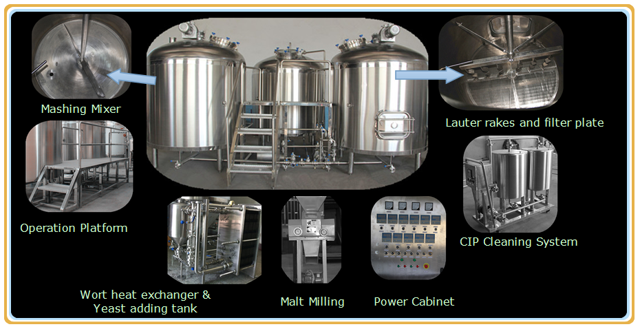 1.Mashing system : it is the semi-automatic machine with seperated power controller which is fixed near to this sytem to be convenient to operate it , the heating process is automatic with 5 phase programmes inside ; this brewhouse can brew 2-3 times per day , the hot water absorbed from the wort heat exchanger can be reused to save the energy.